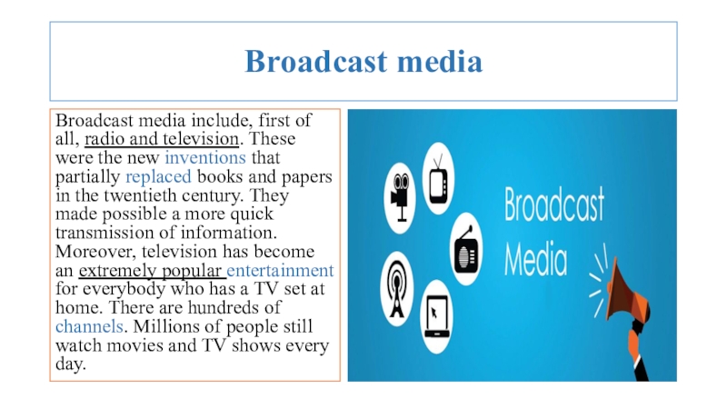 Broadcast mediaBroadcast media include, first of all, radio and television. These were the new inventions that partially