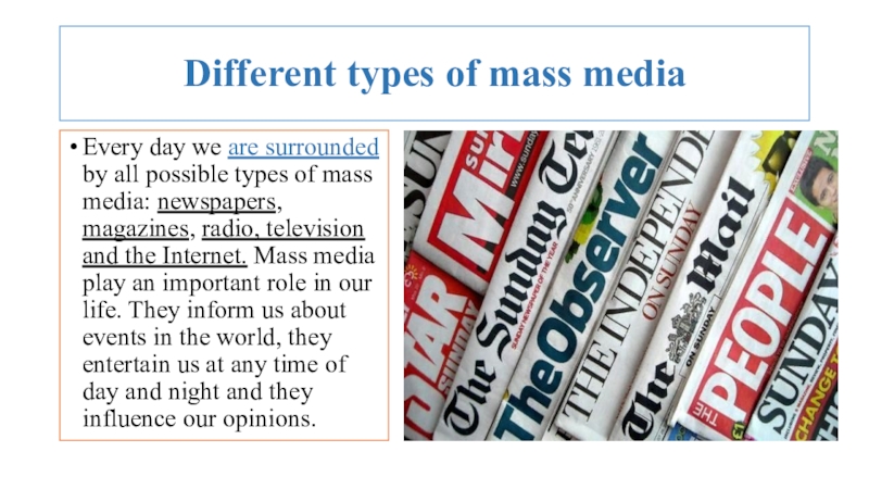 Different types of mass mediaEvery day we are surrounded by all possible types of mass media: newspapers, magazines, radio, television and the Internet. Mass media play an important role in our life. They inform us about
