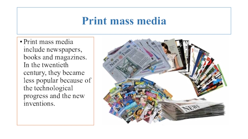 Print mass media Print mass media include newspapers, books and magazines. In the twentieth century, they became