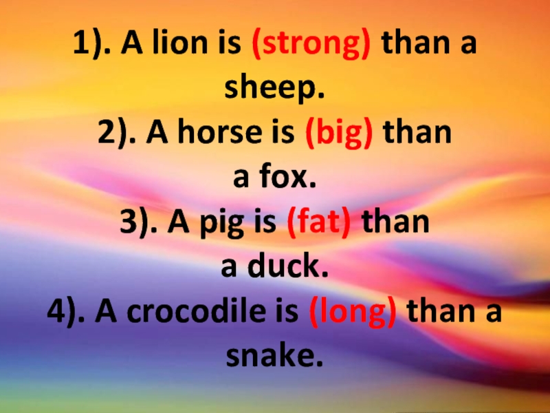 Слайд 411). A lion is (strong) than a sheep. 2). A horse is