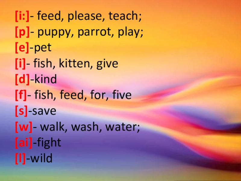 Слайд 3[i:]- feed, please, teach; [p]- puppy, parrot, play; [e]-pet [i]- fish, kitten,