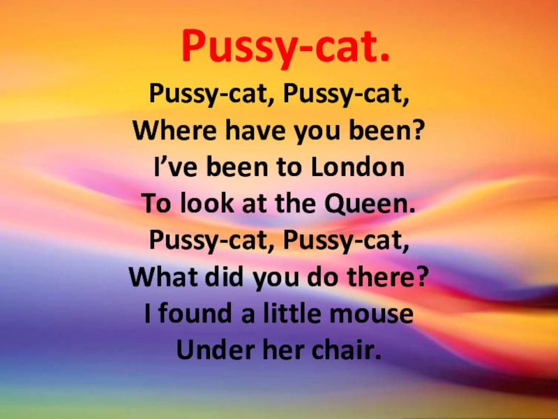 Слайд 43  Pussy-cat. Pussy-cat, Pussy-cat, Where have you been? I’ve been to London To look at