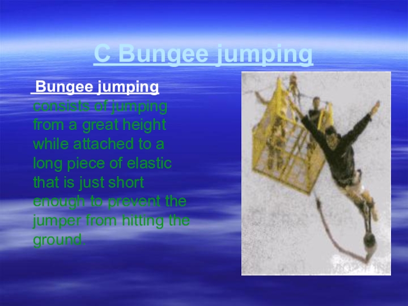 С Bungee jumping  Bungee jumping consists of jumping from a great height while attached to a