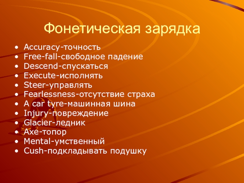 Фонетическая зарядкаAccuracy-точностьFree-fall-свободное падениеDescend-спускатьсяExecute-исполнятьSteer-управлятьFearlessness-отсутствие страхаA car tyre-машинная шинаInjury-повреждениеGlacier-ледникAxe-топорMental-умственныйCush-подкладывать подушку