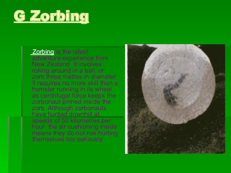 New Zealand. It involves rolling around in a ball, or zorb three metres in diameter. It requires no more skill than a hamster running in its wheel as centrifugal force keeps the zorbonaut pinned inside the zorb. Although zorbonauts have hurtled downhill at speeds of 50 kilometres per hour, the air cushioning inside means they do not risk hurting themselves too seriously.