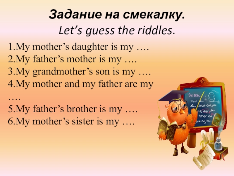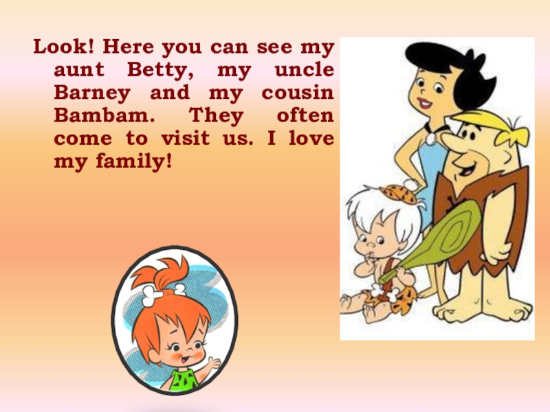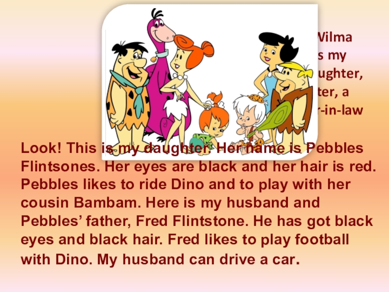 Look! This is my daughter. Her name is Pebbles Flintsones. Her eyes are black and her hair is red. Pebbles likes to ride Dino and to play with her cousin Bambam. Here is my husband and Pebbles’ father, Fred Flintstone. He has got black eyes and black hair. Fred likes to play football with Dino. My husband can drive a car.