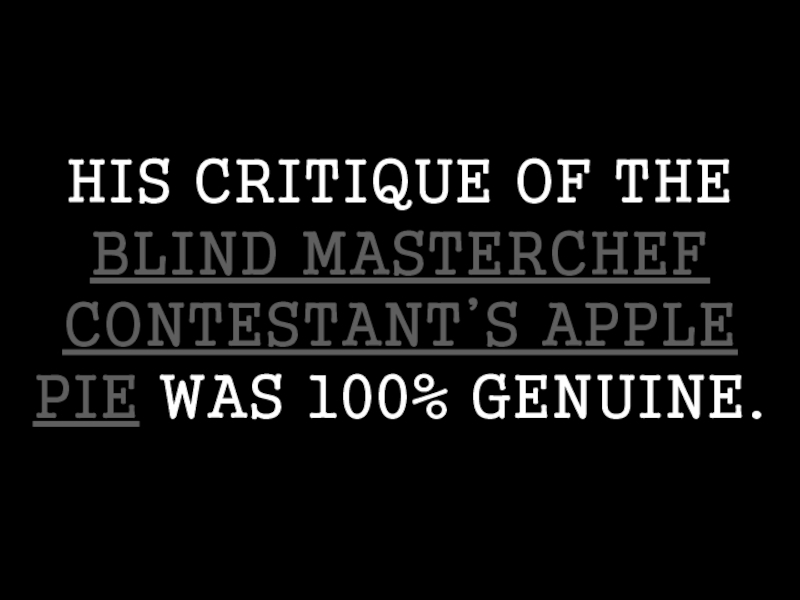 Слайд 12HIS CRITIQUE OF THE BLIND MASTERCHEF CONTESTANT’S APPLE PIE WAS 100%