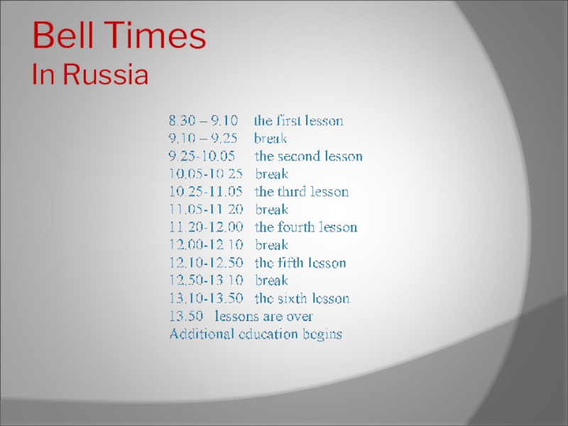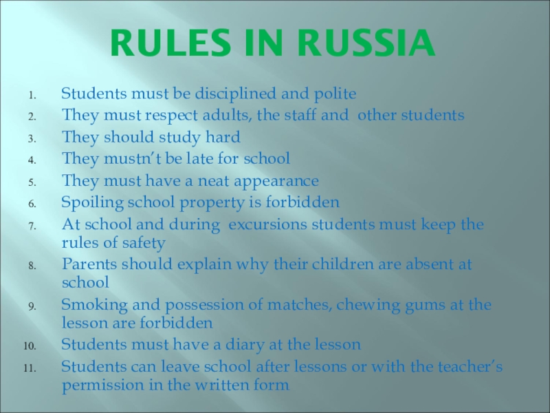 RULES IN RUSSIAStudents must be disciplined and politeThey must respect adults, the staff and other studentsThey should