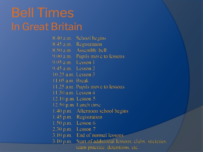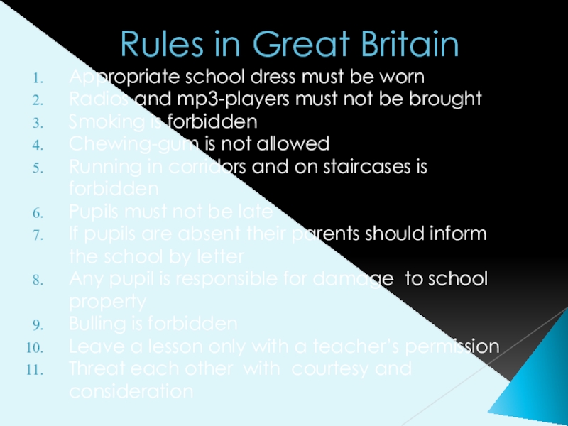 Rules in Great BritainAppropriate school dress must be wornRadios and mp3-players must not be broughtSmoking is forbiddenChewing-gum