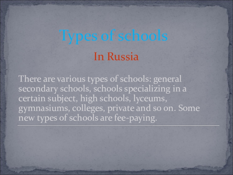 Types of schools   In RussiaThere are various types of schools: general secondary schools, schools specializing