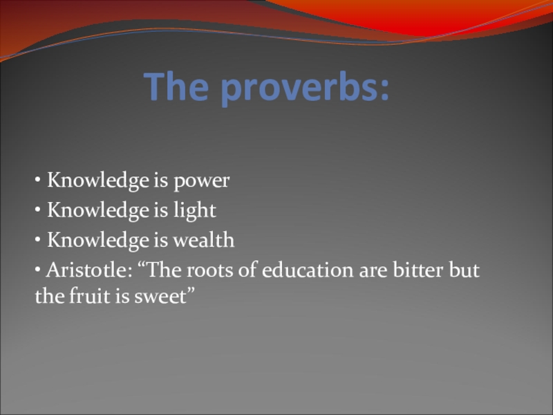 The proverbs: • Knowledge is power• Knowledge is light• Knowledge is wealth• Aristotle: “The roots of education are bitter but the fruit is sweet”