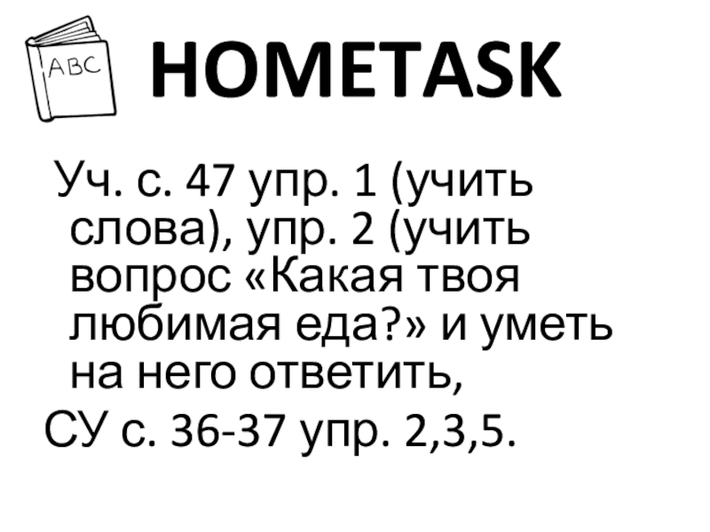 HOMETASK Уч. с. 47 упр. 1 (учить слова), упр. 2 (учить вопрос «Какая твоя любимая еда?» и