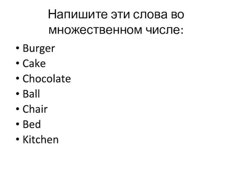 Напишите эти слова во множественном числе:BurgerCakeChocolateBallChairBedKitchen