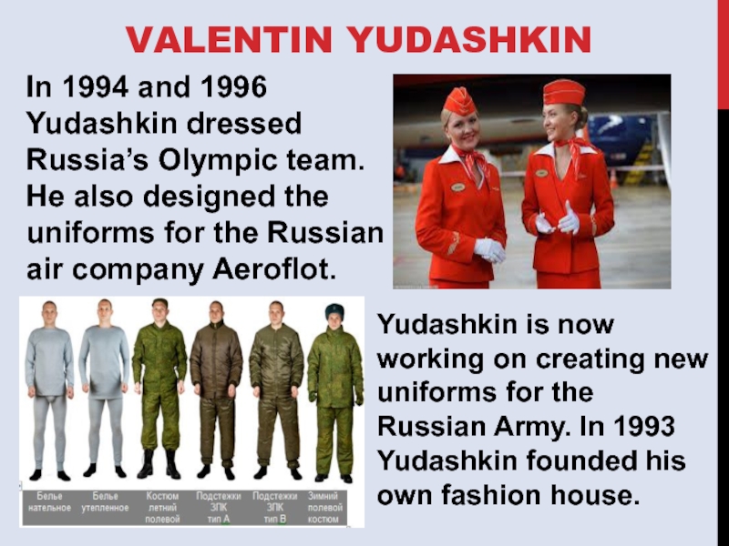 Yudashkin is now working on creating new uniforms for the Russian Army. In 1993 Yudashkin founded his own fashion house.