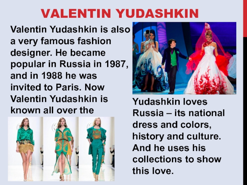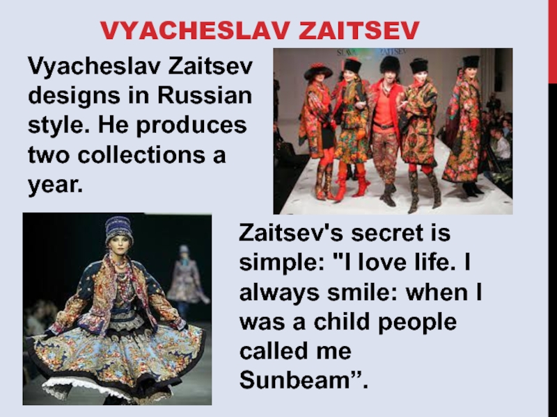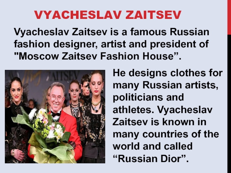 He designs clothes for many Russian artists, politicians and athletes. Vyacheslav Zaitsev is known in many countries of the world and called “Russian Dior”.