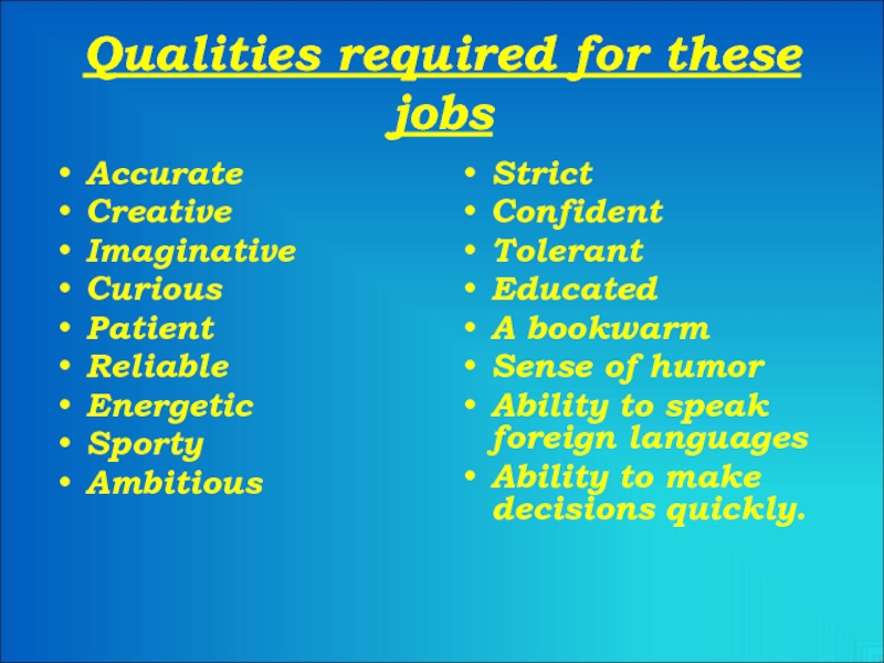 Слайд 24Qualities required for these jobs
