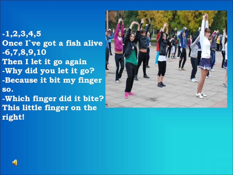 -1,2,3,4,5Once I`ve got a fish alive-6,7,8,9,10Then I let it go again-Why did you let it go?-Because it