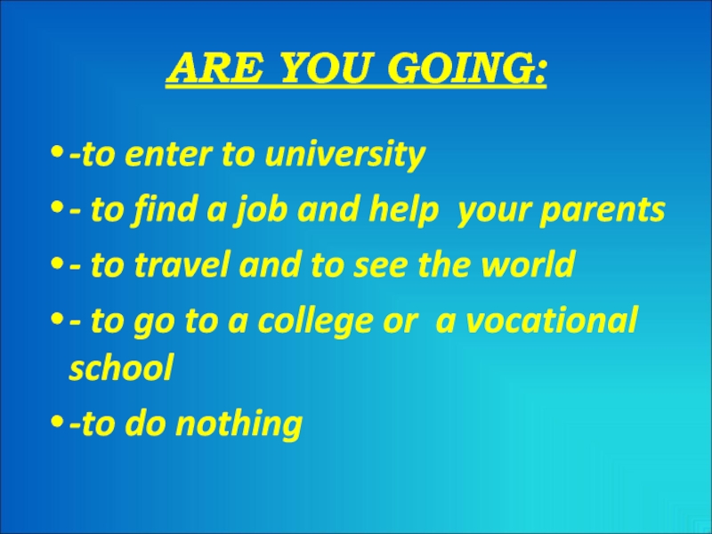 ARE YOU GOING:-to enter to university- to find a job and help your parents- to travel and