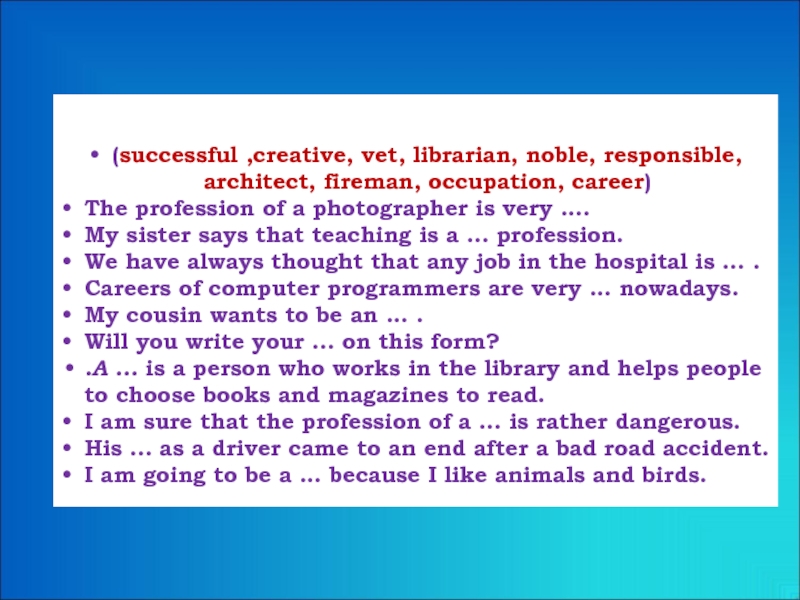 (successful ,creative, vet, librarian, noble, responsible, architect, fireman, occupation, career)
