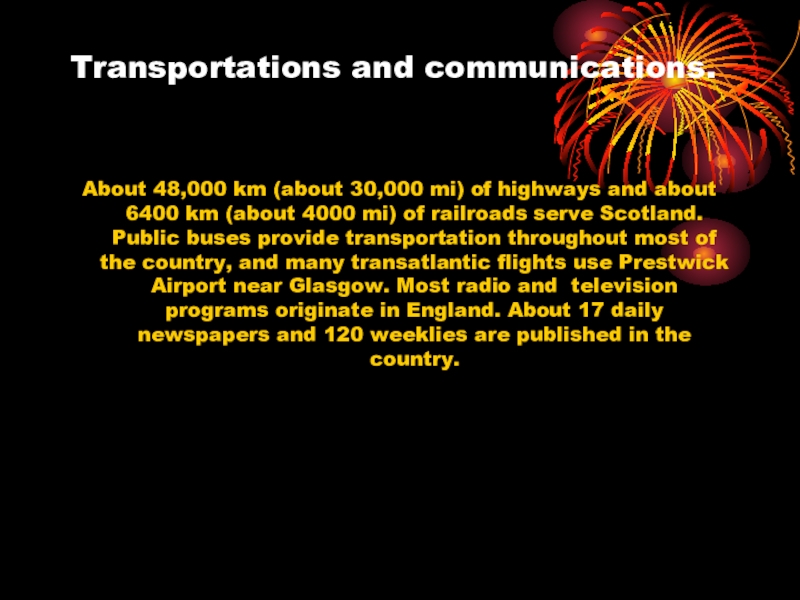 about 6400 km (about 4000 mi) of railroads serve Scotland. Public buses provide transportation throughout most of the country, and many transatlantic flights use Prestwick Airport near Glasgow. Most radio and television programs originate in England. About 17 daily newspapers and 120 weeklies are published in the country.