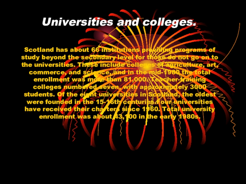 beyond the secondary level for those do not go on to the universities. These include colleges of agriculture, art, commerce, and science, and in the mid-1980 the total enrollment was more than 81,000. Teacher-training colleges numbered seven, with approximately 3000 students. Of the eight universities in Scotland, the oldest were founded in the 15-16th centuries.Four universities have received their charters since 1960. Total university enrollment was about 43,100 in the early 1980s.