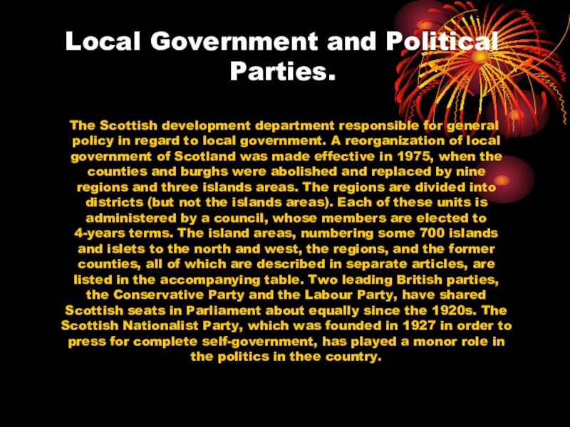 for general policy in regard to local government. A reorganization of local government of Scotland was made effective in 1975, when the counties and burghs were abolished and replaced by nine regions and three islands areas. The regions are divided into districts (but not the islands areas). Each of these units is administered by a council, whose members are elected to 4-years terms. The island areas, numbering some 700 islands and islets to the north and west, the regions, and the former counties, all of which are described in separate articles, are listed in the accompanying table. Two leading British parties, the Conservative Party and the Labour Party, have shared Scottish seats in Parliament about equally since the 1920s. The Scottish Nationalist Party, which was founded in 1927 in order to press for complete self-government, has played a monor role in the politics in thee country.