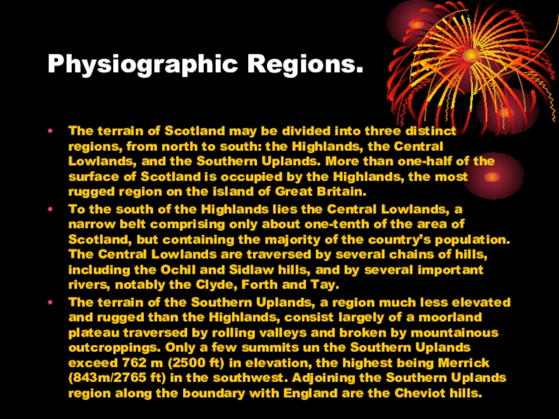 regions, from north to south: the Highlands, the Central Lowlands, and the Southern Uplands. More than one-half of the surface of Scotland is occupied by the Highlands, the most rugged region on the island of Great Britain.