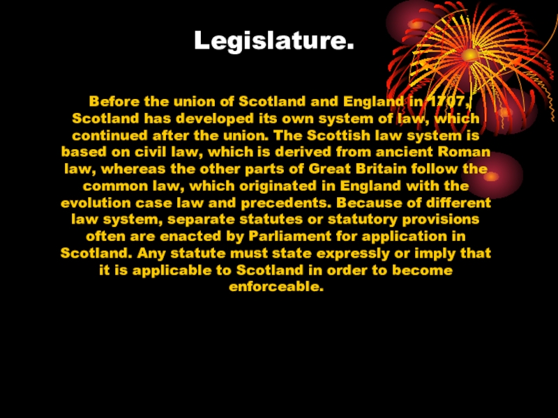 1707, Scotland has developed its own system of law, which continued after the union. The Scottish law system is based on civil law, which is derived from ancient Roman law, whereas the other parts of Great Britain follow the common law, which originated in England with the evolution case law and precedents. Because of different law system, separate statutes or statutory provisions often are enacted by Parliament for application in Scotland. Any statute must state expressly or imply that it is applicable to Scotland in order to become enforceable.