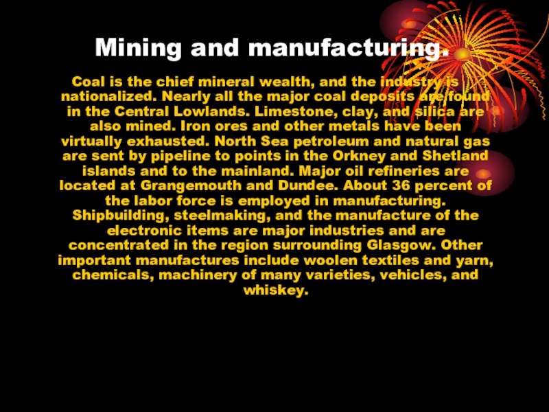 is nationalized. Nearly all the major coal deposits are found in the Central Lowlands. Limestone, clay, and silica are also mined. Iron ores and other metals have been virtually exhausted. North Sea petroleum and natural gas are sent by pipeline to points in the Orkney and Shetland islands and to the mainland. Major oil refineries are located at Grangemouth and Dundee. About 36 percent of the labor force is employed in manufacturing. Shipbuilding, steelmaking, and the manufacture of the electronic items are major industries and are concentrated in the region surrounding Glasgow. Other important manufactures include woolen textiles and yarn, chemicals, machinery of many varieties, vehicles, and whiskey.