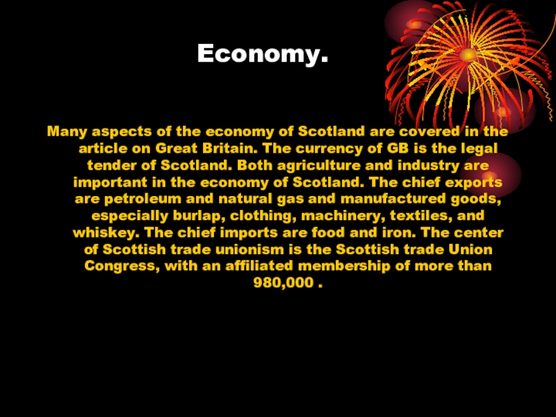 article on Great Britain. The currency of GB is the legal tender of Scotland. Both agriculture and industry are important in the economy of Scotland. The chief exports are petroleum and natural gas and manufactured goods, especially burlap, clothing, machinery, textiles, and whiskey. The chief imports are food and iron. The center of Scottish trade unionism is the Scottish trade Union Congress, with an affiliated membership of more than 980,000 .
