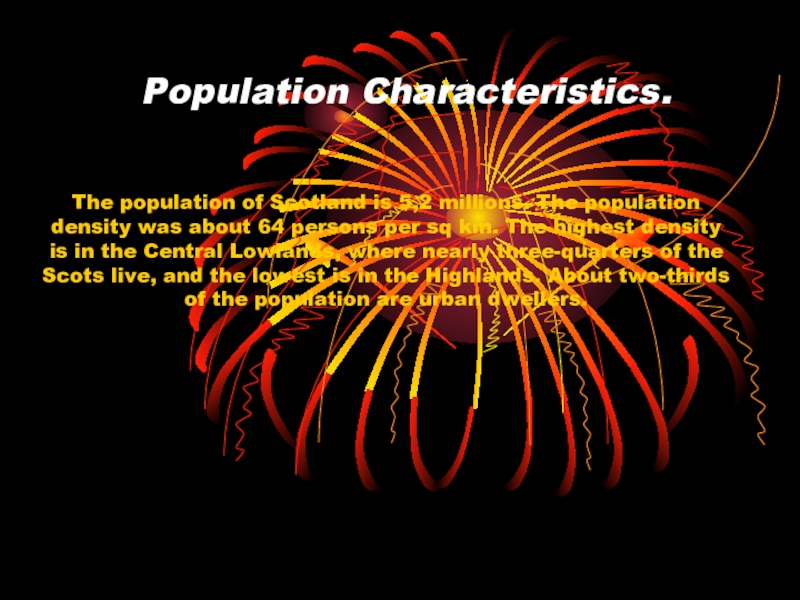 was about 64 persons per sq km. The highest density is in the Central Lowlands, where nearly three-quarters of the Scots live, and the lowest is in the Highlands. About two-thirds of the population are urban dwellers.