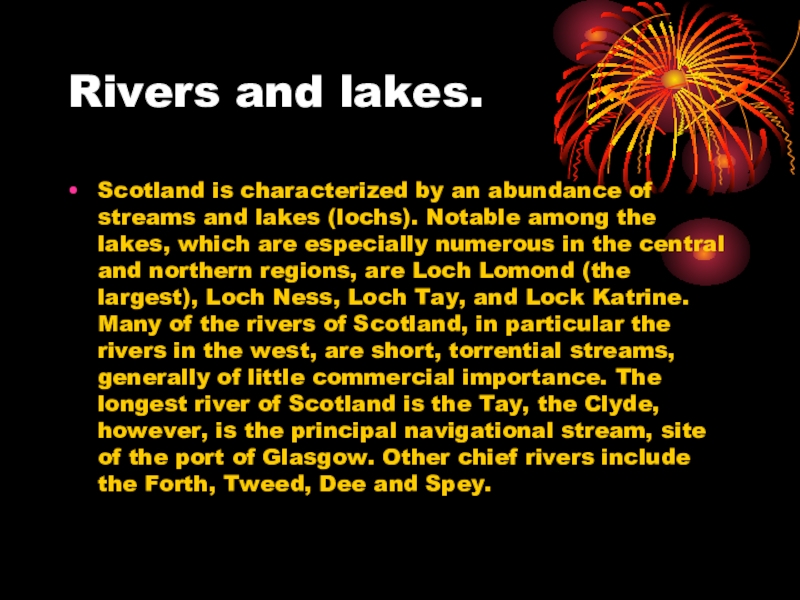 lakes (lochs). Notable among the lakes, which are especially numerous in the central and northern regions, are Loch Lomond (the largest), Loch Ness, Loch Tay, and Lock Katrine. Many of the rivers of Scotland, in particular the rivers in the west, are short, torrential streams, generally of little commercial importance. The longest river of Scotland is the Tay, the Clyde, however, is the principal navigational stream, site of the port of Glasgow. Other chief rivers include the Forth, Tweed, Dee and Spey.