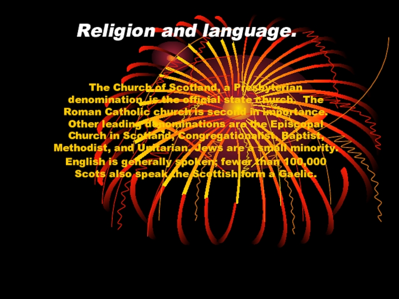 official state church. The Roman Catholic church is second in importance. Other leading denominations are the Episcopal Church in Scotland, Congregationalist, Baptist, Methodist, and Unitarian. Jews are a small minority.