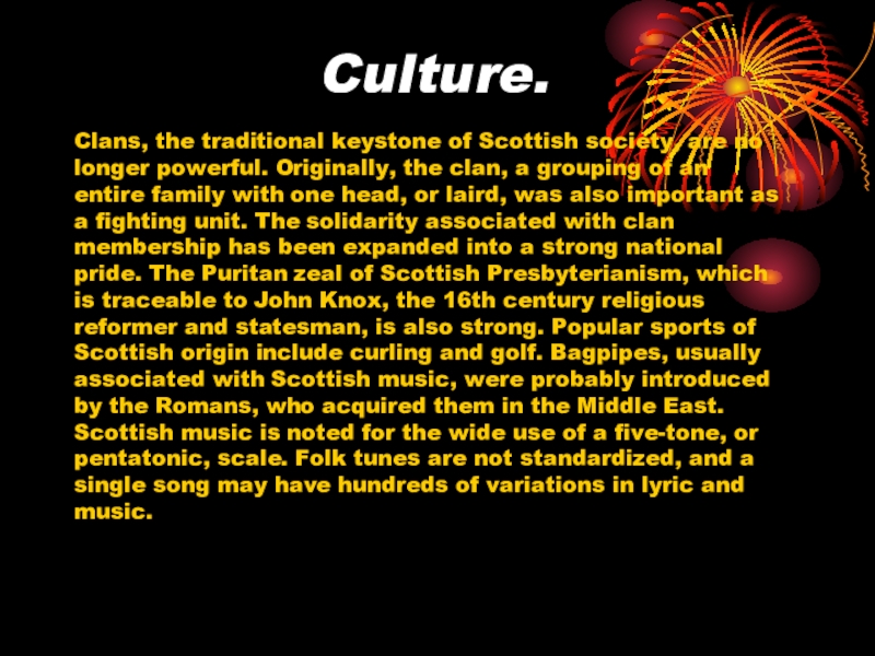 Originally, the clan, a grouping of an entire family with one head, or laird, was also important as a fighting unit. The solidarity associated with clan membership has been expanded into a strong national pride. The Puritan zeal of Scottish Presbyterianism, which is traceable to John Knox, the 16th century religious reformer and statesman, is also strong. Popular sports of Scottish origin include curling and golf. Bagpipes, usually associated with Scottish music, were probably introduced by the Romans, who acquired them in the Middle East. Scottish music is noted for the wide use of a five-tone, or pentatonic, scale. Folk tunes are not standardized, and a single song may have hundreds of variations in lyric and music.