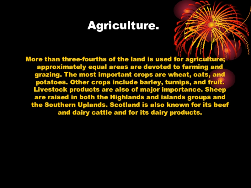 equal areas are devoted to farming and grazing. The most important crops are wheat, oats, and potatoes. Other crops include barley, turnips, and fruit. Livestock products are also of major importance. Sheep are raised in both the Highlands and islands groups and the Southern Uplands. Scotland is also known for its beef and dairy cattle and for its dairy products.