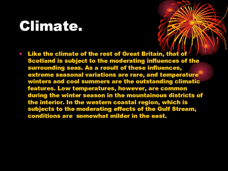 Scotland is subject to the moderating influences of the surrounding seas. As a result of these influences, extreme seasonal variations are rare, and temperature winters and cool summers are the outstanding climatic features. Low temperatures, however, are common during the winter season in the mountainous districts of the interior. In the western coastal region, which is subjects to the moderating effects of the Gulf Stream, conditions are somewhat milder in the east.