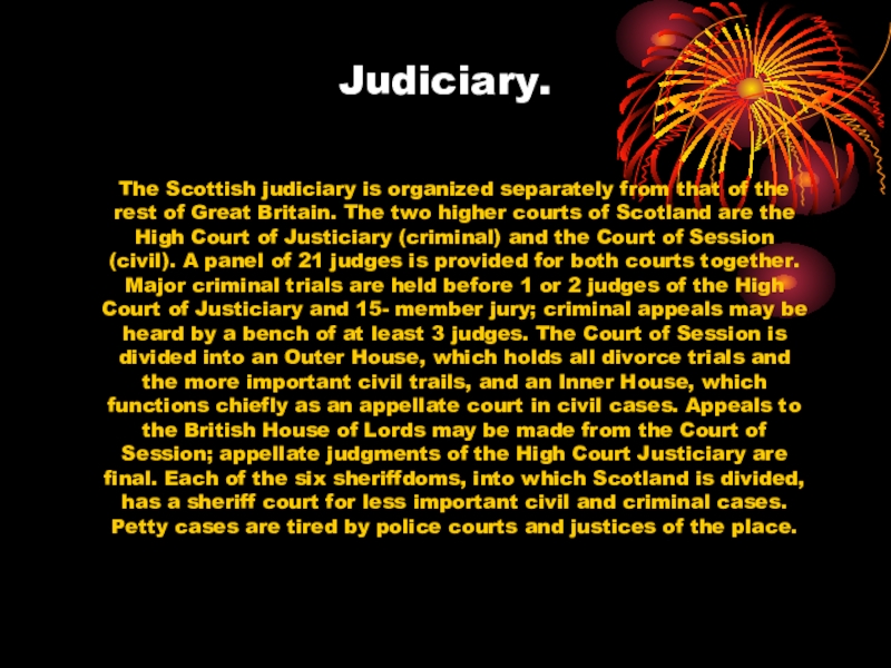 that of the rest of Great Britain. The two higher courts of Scotland are the High Court of Justiciary (criminal) and the Court of Session (civil). A panel of 21 judges is provided for both courts together. Major criminal trials are held before 1 or 2 judges of the High Court of Justiciary and 15- member jury; criminal appeals may be heard by a bench of at least 3 judges. The Court of Session is divided into an Outer House, which holds all divorce trials and the more important civil trails, and an Inner House, which functions chiefly as an appellate court in civil cases. Appeals to the British House of Lords may be made from the Court of Session; appellate judgments of the High Court Justiciary are final. Each of the six sheriffdoms, into which Scotland is divided, has a sheriff court for less important civil and criminal cases. Petty cases are tired by police courts and justices of the place.