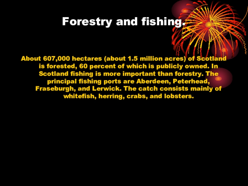 is forested, 60 percent of which is publicly owned. In Scotland fishing is more important than forestry. The principal fishing ports are Aberdeen, Peterhead, Fraseburgh, and Lerwick. The catch consists mainly of whitefish, herring, crabs, and lobsters.
