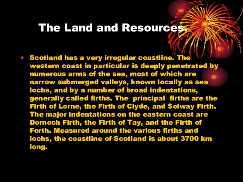coastline. The western coast in particular is deeply penetrated by numerous arms of the sea, most of which are narrow submerged valleys, known locally as sea lochs, and by a number of broad indentations, generally called firths. The principal firths are the Firth of Lorne, the Firth of Clyde, and Solway Firth. The major indentations on the eastern coast are Dornoch Firth, the Firth of Tay, and the Firth of Forth. Measured around the various firths and lochs, the coastline of Scotland is about 3700 km long.