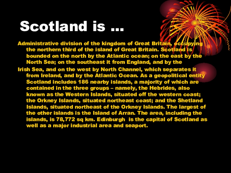 Irish Sea, and on the west by North Channel, which separates it from Ireland, and by the Atlantic Ocean. As a geopolitical entity Scotland includes 186 nearby islands, a majority of which are contained in the three groups – namely, the Hebrides, also known as the Western Islands, situated off the western coast; the Orkney Islands, situated northeast coast; and the Shetland Islands, situated northeast of the Orkney Islands. The largest of the other islands is the Island of Arran. The area, including the islands, is 78,772 sq km. Edinburgh is the capital of Scotland as well as a major industrial area and seaport.