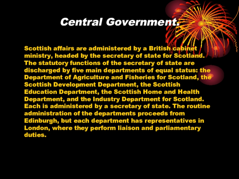 by the secretary of state for Scotland. The statutory functions of the secretary of state are discharged by five main departments of equal status: the Department of Agriculture and Fisheries for Scotland, the Scottish Development Department, the Scottish Education Department, the Scottish Home and Health Department, and the Industry Department for Scotland. Each is administered by a secretary of state. The routine administration of the departments proceeds from Edinburgh, but each department has representatives in London, where they perform liaison and parliamentary duties.