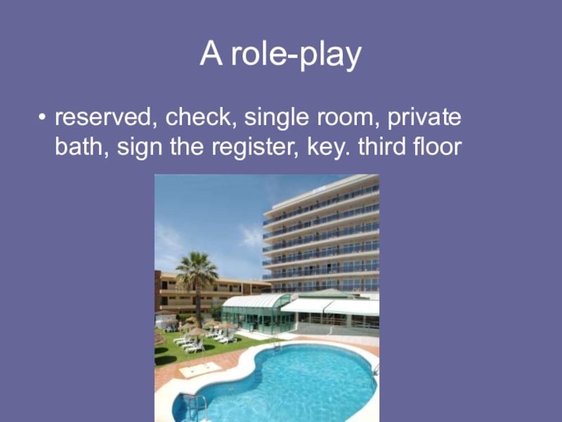 A role-playreserved, check, single room, private bath, sign the register, key. third floor