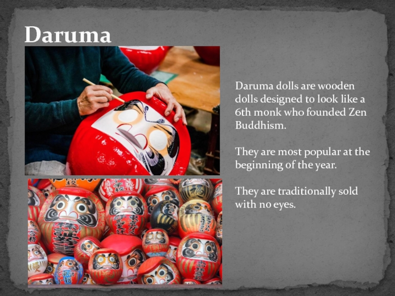 Daruma Daruma dolls are wooden dolls designed to look like a 6th monk who founded Zen Buddhism. They