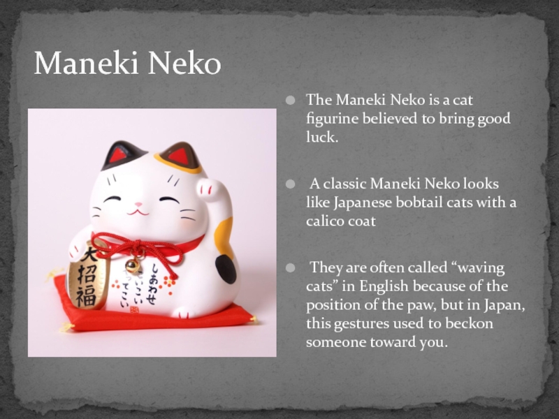 Maneki NekoThe Maneki Neko is a cat figurine believed to bring good luck. A classic Maneki Neko looks like Japanese bobtail cats with a calico coat They are often called “waving cats” in English because of
