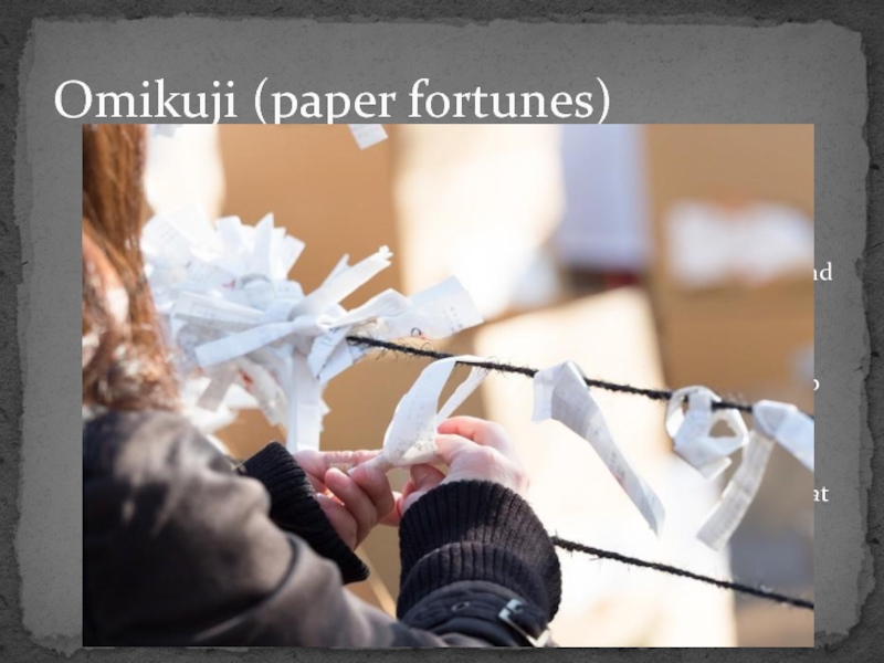 Omikuji (paper fortunes)Omikuji are strips of paper containing good or bad predictions. They are available at shrines