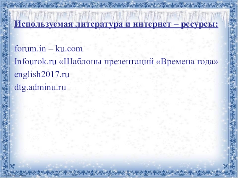Используемая литература и интернет – ресурсы: forum.in – ku.comInfourok.ru «Шаблоны презентаций «Времена года»english2017.rudtg.adminu.ru