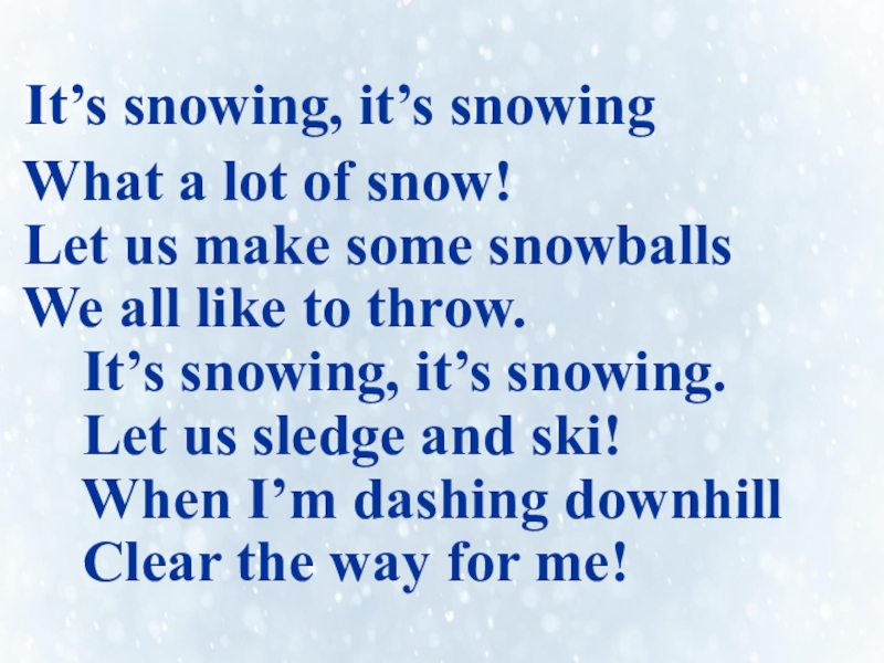 Let us make some snowballs We all like to throw. It’s snowing, it’s snowing. Let us sledge and ski! When I’m dashing downhill Clear the way for me!