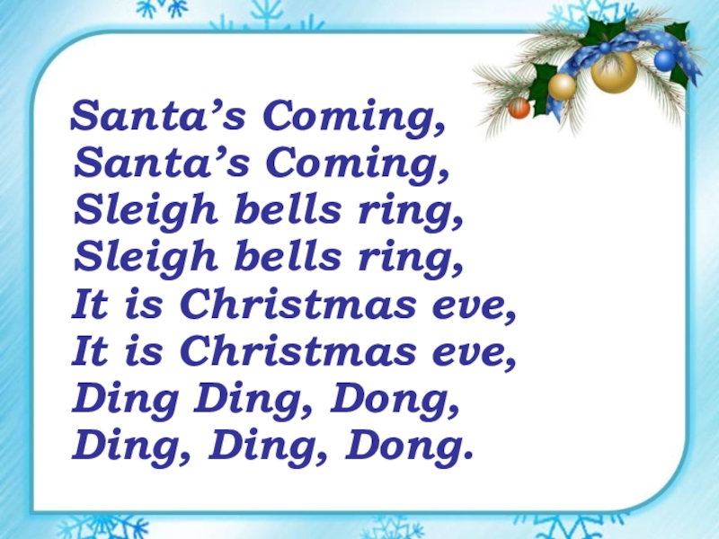 Слайд 13 Santa’s Coming, Santa’s Coming, Sleigh bells ring, Sleigh bells ring, It is Christmas