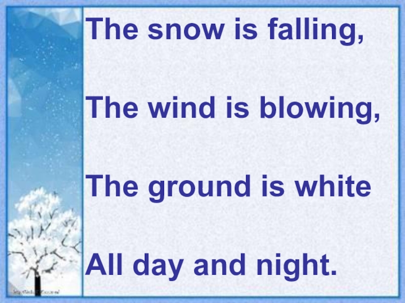 The snow is falling, The wind is blowing, The ground is white All day and night.
