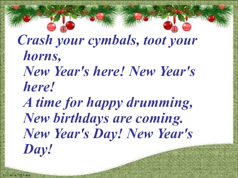 Слайд 12 Crash your cymbals, toot your horns, New Year's here! New Year's